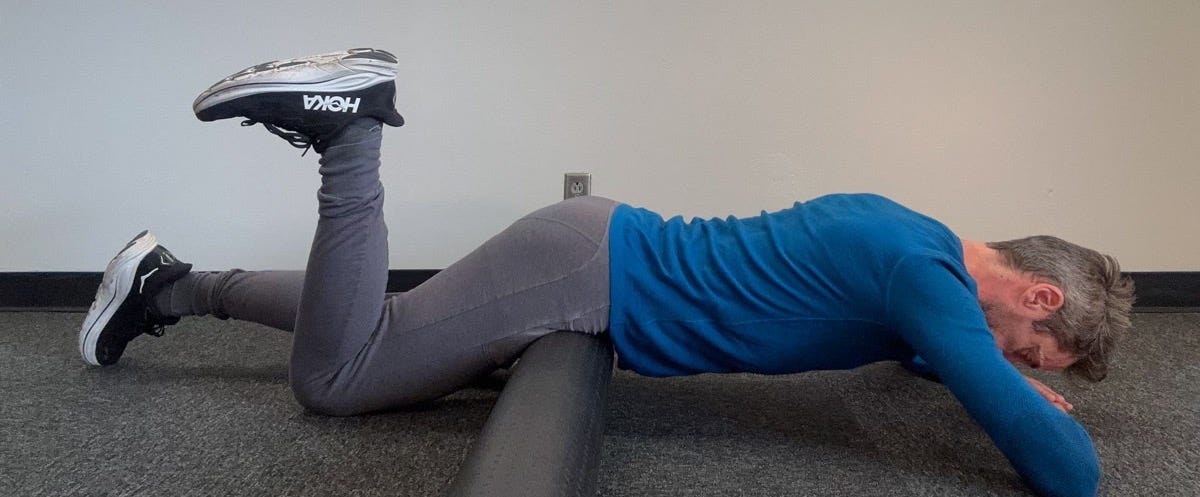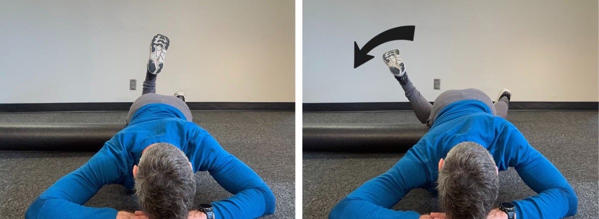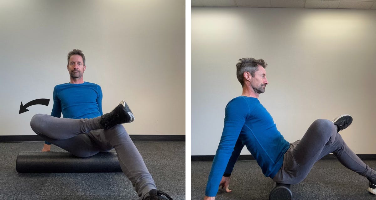 On-axis mobilization: Add crossed-leg oscillatory external rotation with posterior hip on top of roll (3–5 min/side daily):Next Step: Continue daily until symmetry improves, then pair with resisted rotation strength (Part 2)