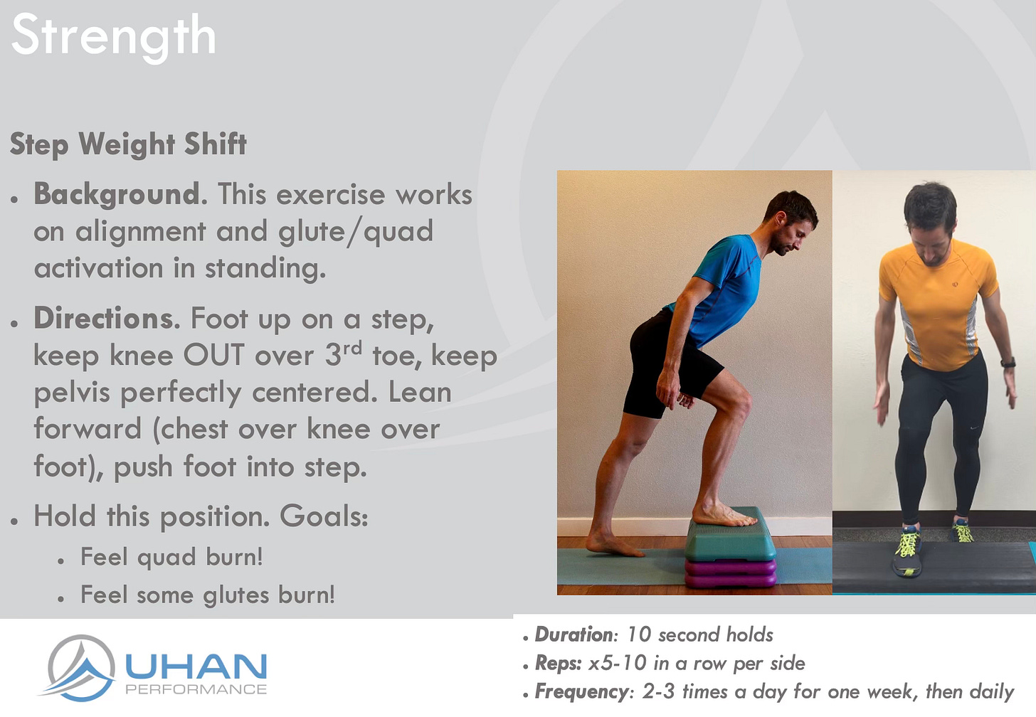 • Neuromuscular stabilization for the knee. We shored up his knee stability, first with the quad, from above. This includes isometric holds in the mid-stance running position (the “Step Weight Shift” courtesy of my great mentor, Jeff Giulietti).
