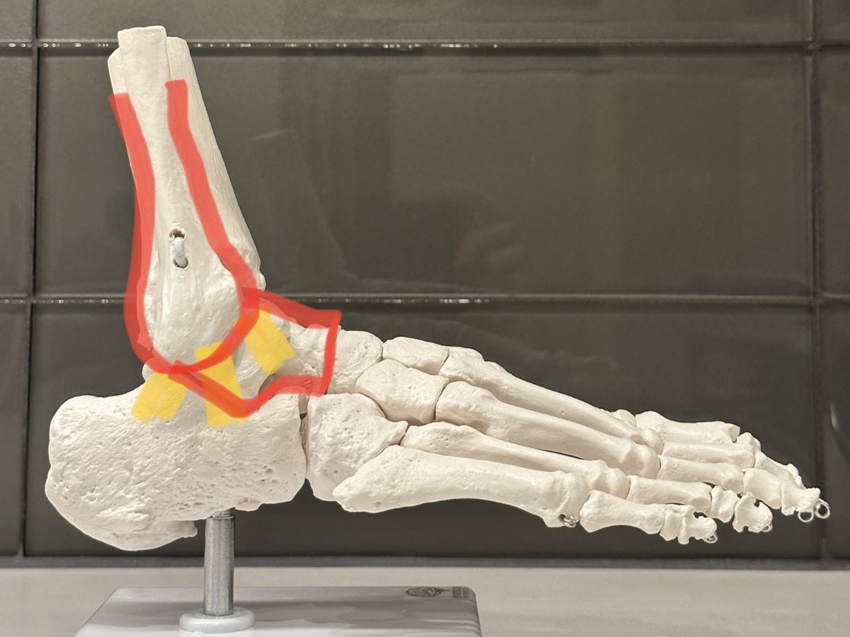 But the biggest chronic outcome of a bad ankle sprain is lost dorsiflexion: when the tibia and fibula fail to glide efficiently over the talus bone.